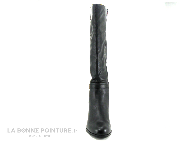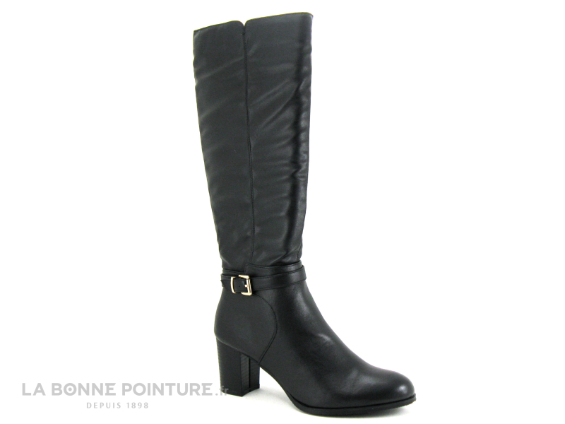 Cette botte Femme est en simili cuir noir, avec une lanière autour de la cheville fermée par une boucle dorée.