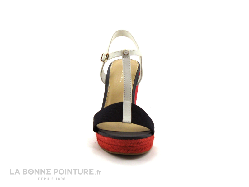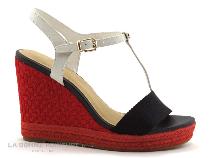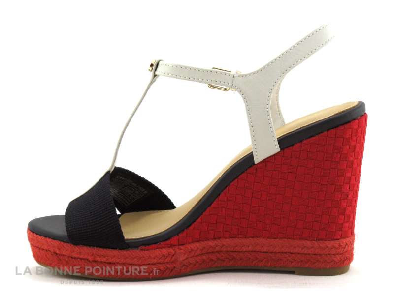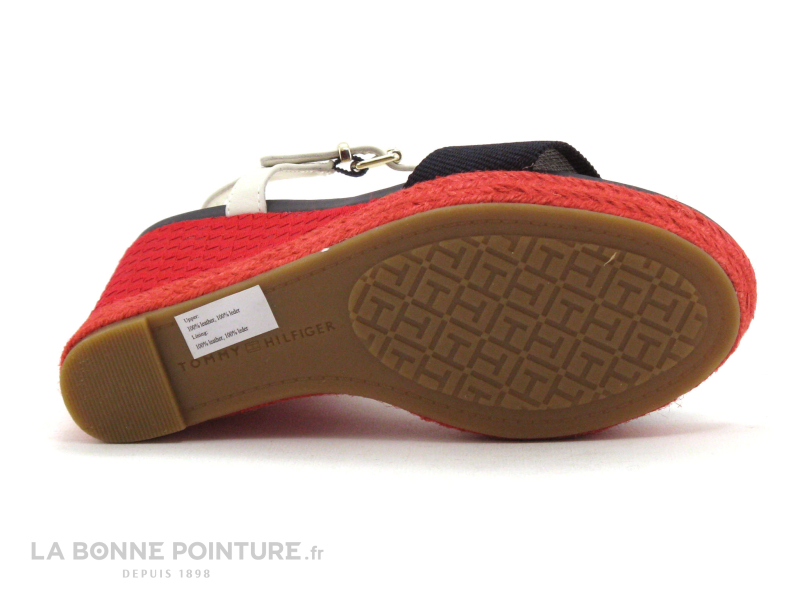 La semelle compensée de la chaussure Tommy Hilfiger donne tout son charme au modèle, habillée d’un textile rouge et ornée de cordes tressées à la base.
