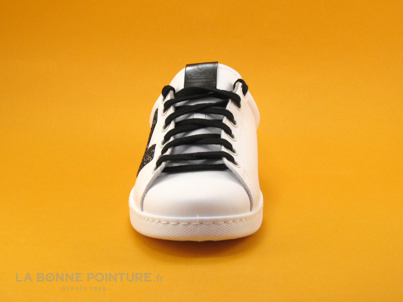 Le lacet contraste en noir, il traverse 6 oeillets pour fermer la chaussure Victoria.
