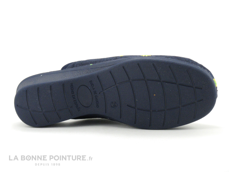 Ce chausson Femme pas cher est en toile bleu foncé, parsemée de petis pois et de fleurs aux tons de jaune, de vert et de blanc.